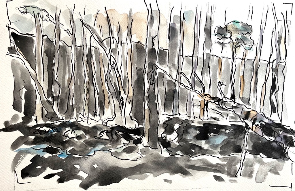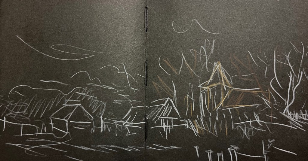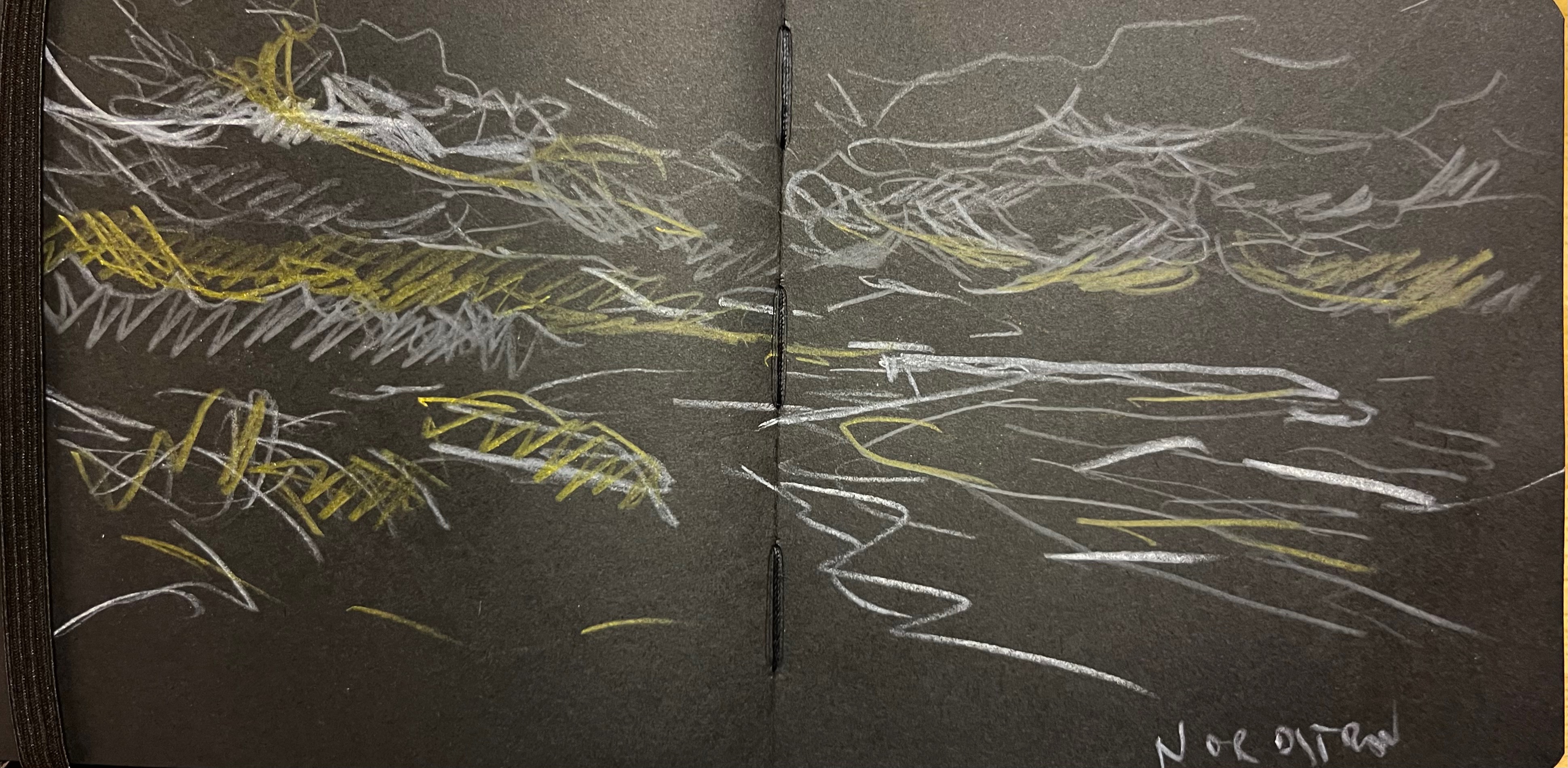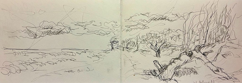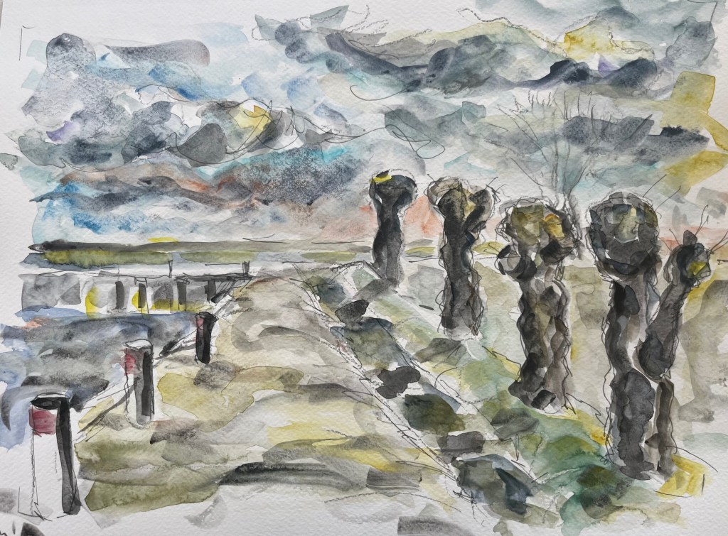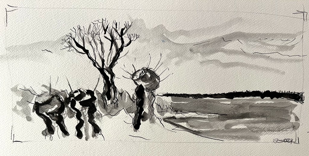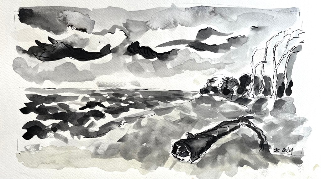 Das Fischland / Darß ist seit meiner Kindheit ein emotionaler Ankerpunkt in meinem Leben. Endlose Sommer (auch mit endlosen Regenfällen, Sommer zwischen FKK und Gummistiefeln), Familienurlaube mit Trabi und Anhänger in den gefühlt ein zweiter Hausstand , nebst Familienzelt auf die Halbinsel gebracht wurden. Schon als Jugendlicher habe ich das Fischland immer wieder gezeichnet und gemalt. Die Alleen, die langen Feldwege, den Bodden, die Strände und Urwälder …. So war dieses Plenair auch eine Rückkehr und Grund genug der Halbinsel in einer von Touristen eher freien Zeit einen Besuch mit Skizzenbuch, Stift und Farbe abzustatten. Kalt war es …